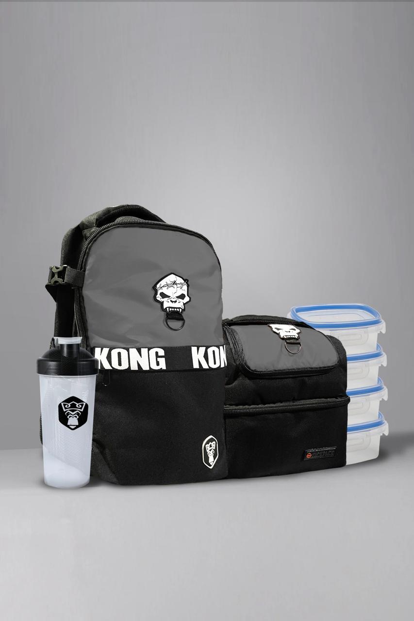MOCHILA GRIS+ LONCHERA+TOPPERS Y SHAKER